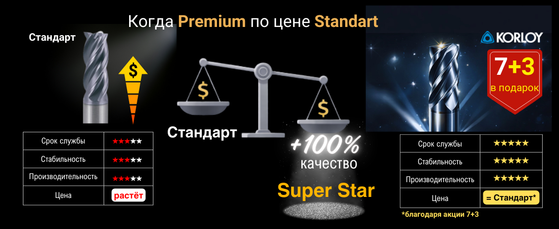 Акция SUPER STAR 7+3 кардинально меняет правила игры: благодаря условиям «7+3» ваша фактическая стоимость топового корейского инструмента Korloy сравнивается с ценой рядового китайского аналога. Вы платите за семь, а в цех отправляете десять единиц надежного инструмента.